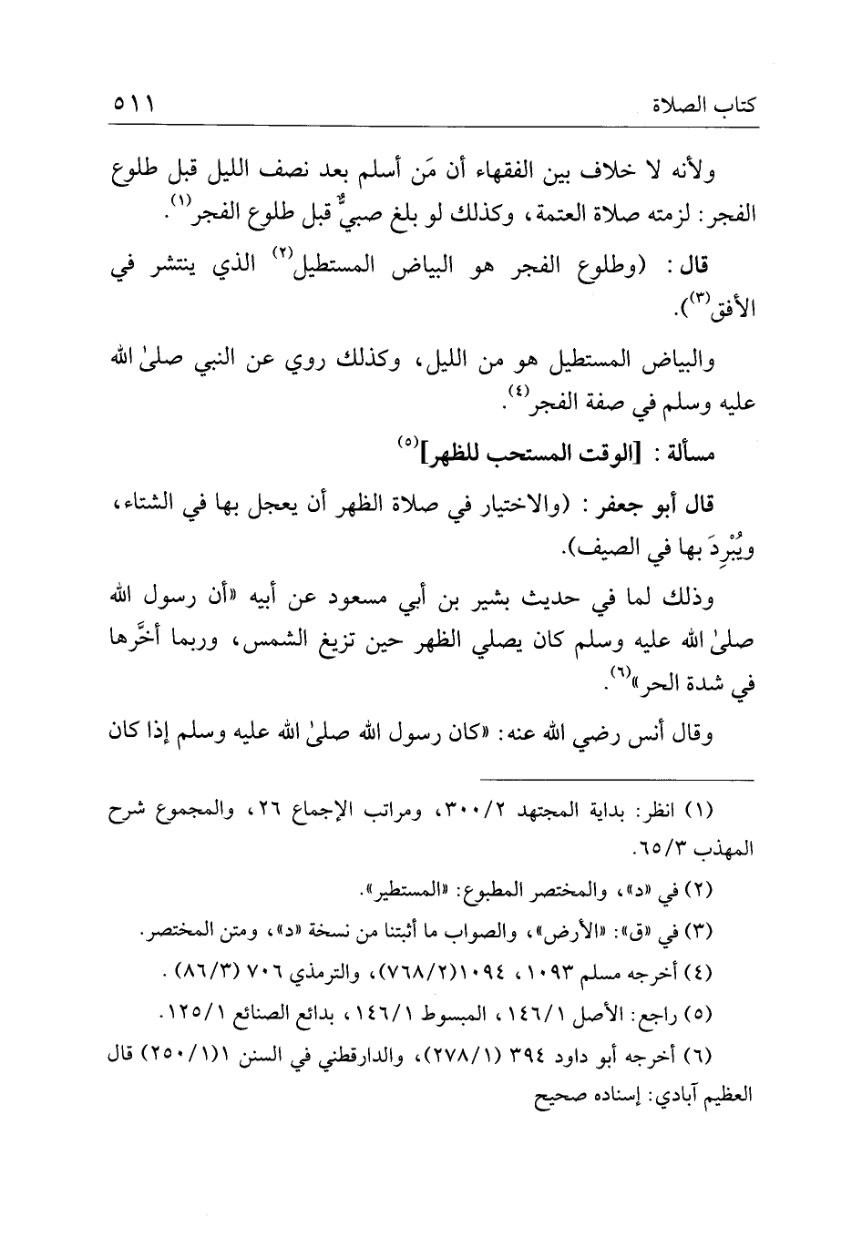 قال أبو جعفر: (والاختيار في صلاة الظهر أن يعجل بها في الشتاء، ويبرد بها في الصيف).
