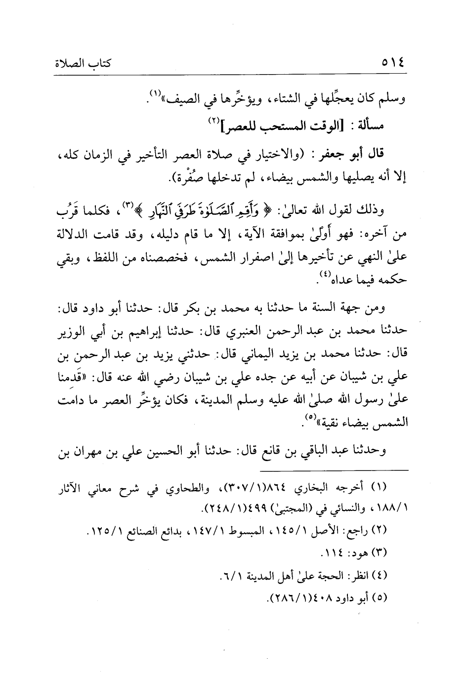 ومن جهة السنه ما حدثنا به محمد بن بكر قال: حدثنا أبو داود قال: حدثنا محمد بن عبد الرحمن العنبري قال: حدثنا إبراهيم بن أبي الوزير قال: حدثنا محمد بن يزيد اليماني قال: حدثني يزيد بن عبد الرحمن بن على بن شيبان عن أبيه عن جده علي بن شيبان رضي الله عنه قال: "قدمنا على رسول الله صلى الله عليه وسلم المدينة، فكان يؤخر العصر ما دامت الشمس بيضاء نقية".