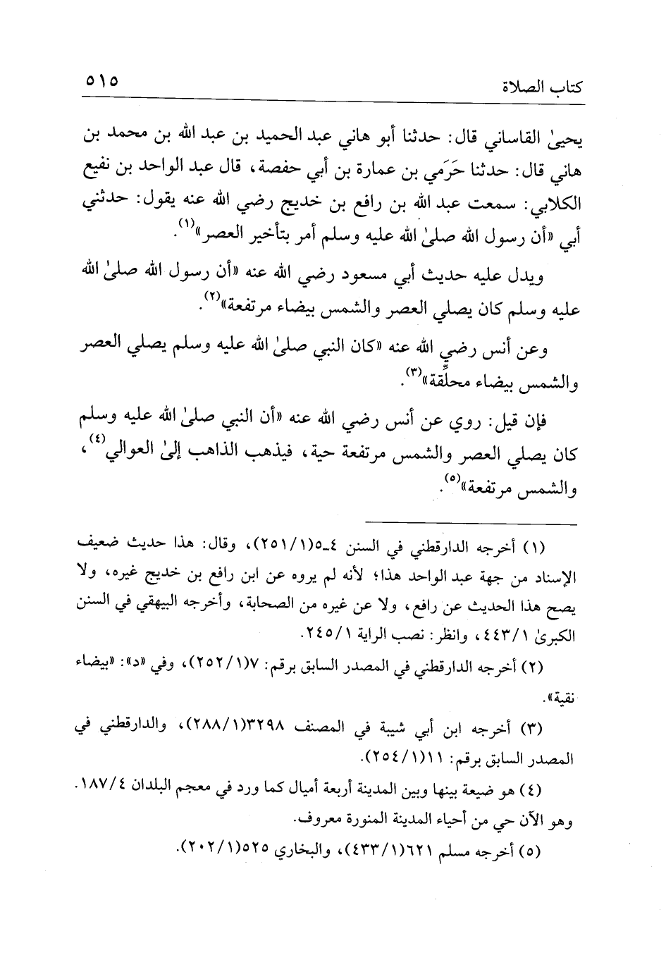 يحيى القاساني قال: حدثنا أبو هاني عبد الحميد بن عبد الله بن محمد بن هاني قال: حدثنا حرمي بن عمارة بن أبي حفصة، قال عبد الواحد بن نفيع الكلابي: سمعت عبد الله بن رافع بن خديج رضي الله عنه يقول: حدثني أبي "أن رسول الله صلى الله عليه وسلم أمر بتأخير العصر".