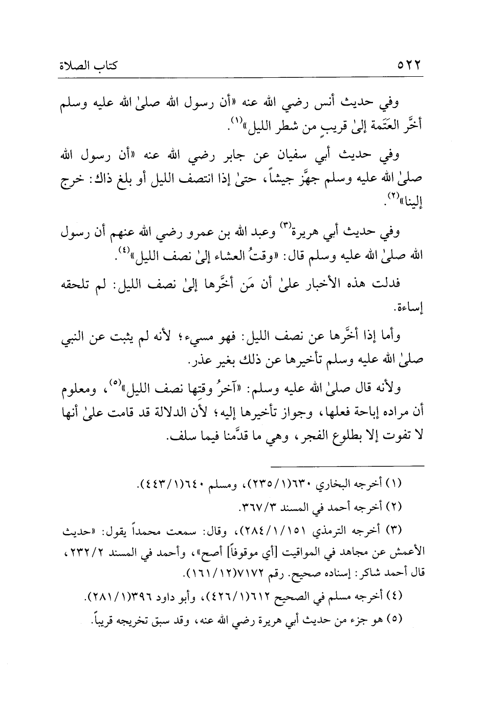 وفي حديث أبي هريرة وعبد الله بن عمرو رضي الله عنهم أن رسول الله صلى الله عليه وسلم قال: "وقت العشاء إلى نصف الليل".