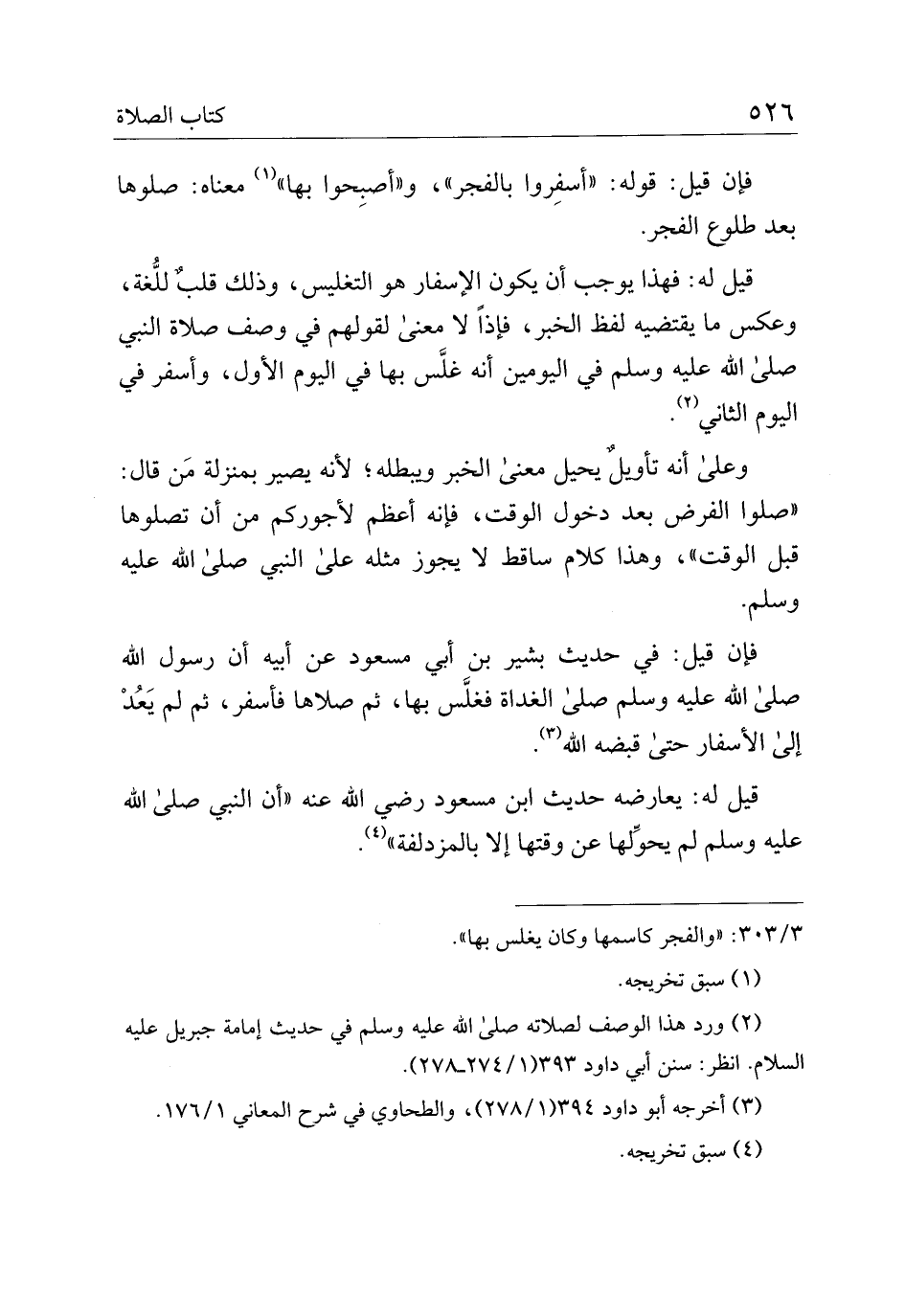 قيل له: فهذا يوجب أن يكون الإسفار هو التغليس, وذلك قلب اللغة وعكس ما يقتضيه لفظ الخبر, فإذا لا معنى لقولهم في وصف صلاة النبي صلى الله عليه وسلم في اليومين أنه غلس بها في اليوم الأول, وأسفر في اليوم الثاني.