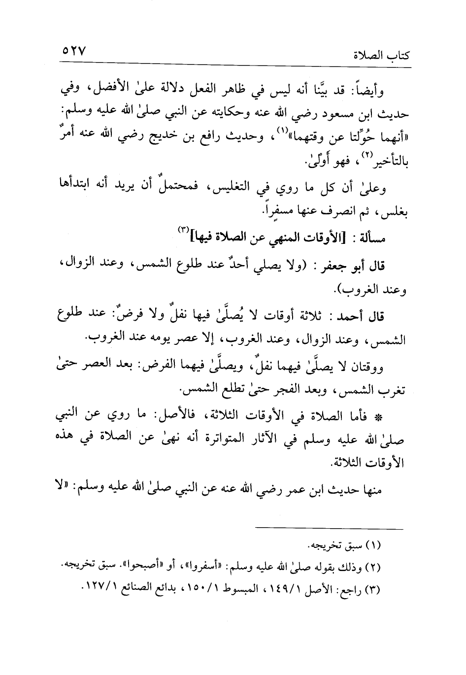 قال أبو جعفر: (ولا يصلي أحد عند طلوع الشمس, وعند الزوال, وعند الغروب).