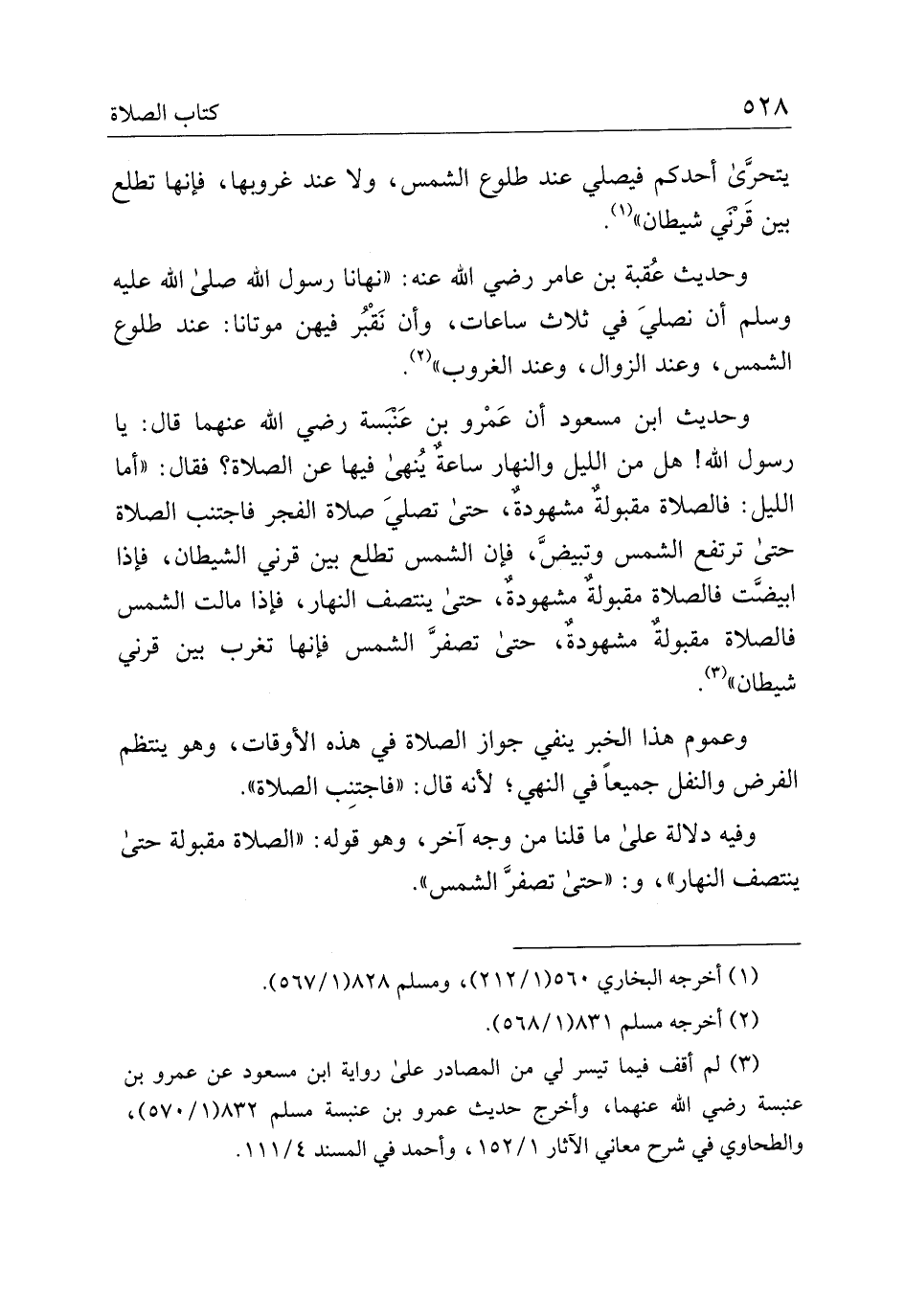 وحديث ابن مسعود أن عمرو بن عنبسة رضي الله عنهما قال: يا رسول الله! هل من الليل والنهار ساعة ينهى فيها عن الصلاة؟ فقال: "أما الليل: فالصلاة مقبولة مشهودة، حتى تصلي صلاة الفجر فاجتنب الصلاة حتى ترتفع الشمس وتبيض، فإن الشمس تطلع بين قرني الشيطان، فإذا ابيضت فالصلاة مقبولة مشهودة، حتى ينتصف النهار، فإذا مالت الشمس فالصلاة مقبولة مشهودة، حتى تصفر الشمس فأنها تغرب بين قرني شيطان".