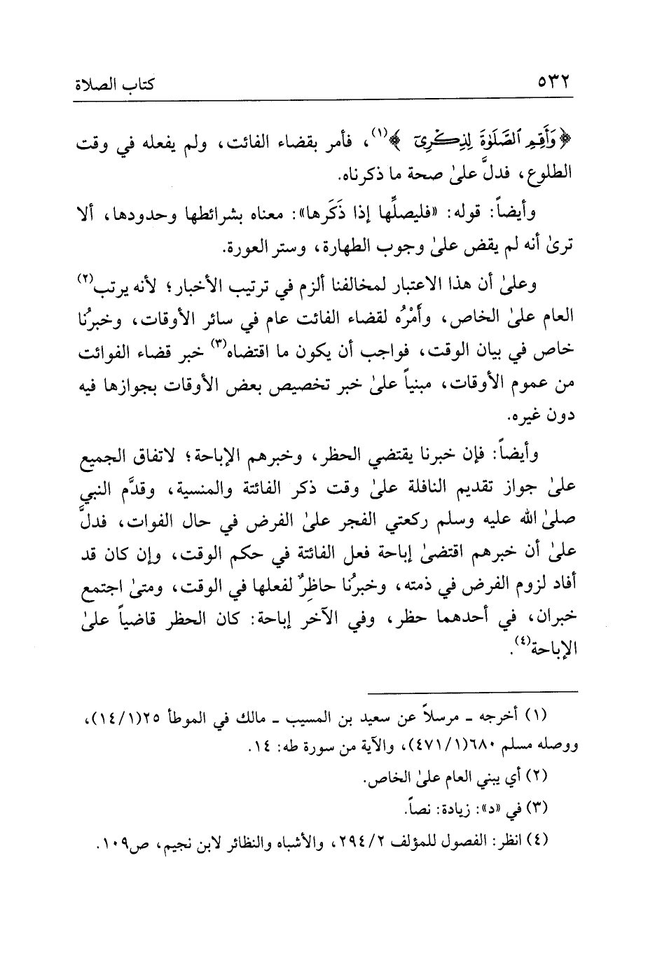 وعلى هذا الاعتبار لمخالفنا ألزم في ترتيب الأخبار؛ لأنه يرتب العام على الخاص، وأمره لقضاء الفائت عام في سائر الأوقات، وخبرنا خاص في بيان الوقت، فواجب أن يكون ما اقتضاه خبر قضاء الفوائت من عموم الأوقات، مبنيا على خبر تخصيص بعض الأوقات بجوازها فيه دون غيره.