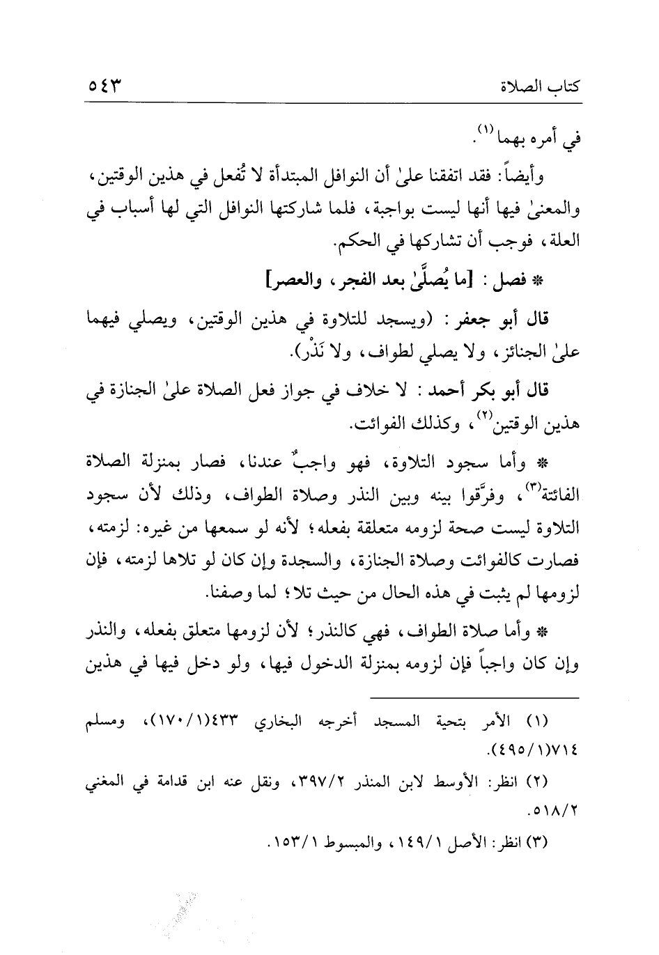 قال أبو جعفر: (ويسجد للتلاوة في هذين الوقتين، ويصلي فيهما على الجنائز، ولا يصلي لطواف، ولا نذر).