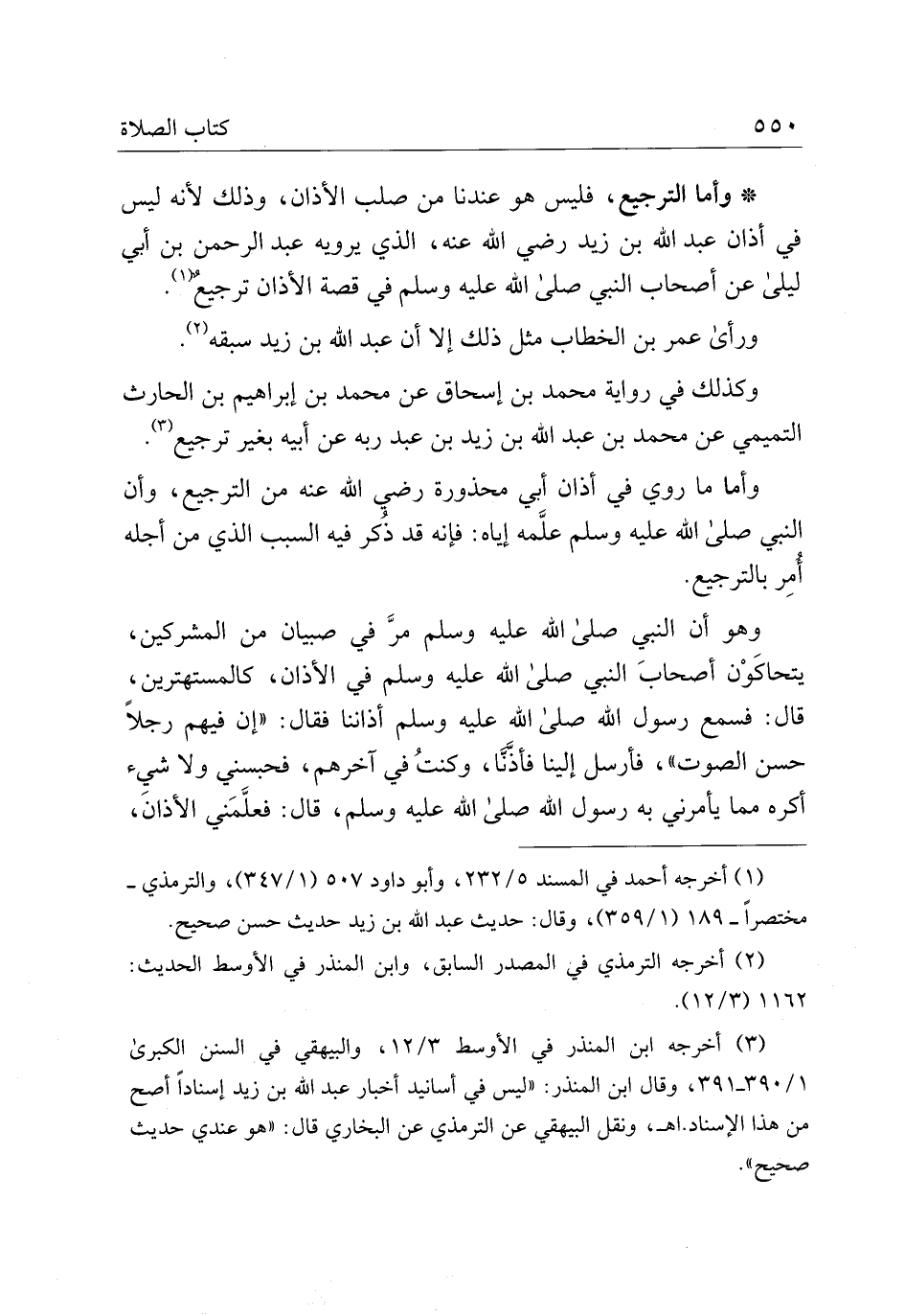 * وأما الترجيع، فليس هو عندنا من صلب الآذان، وذلك لأنه ليس في آذان عبد الله بن زيد رضي الله عنه، الذي يرويه عبد الرحمن بن أبي ليلى عن أصحاب النبي صلى الله عليه وسلم في قصة الآذان ترجيع.