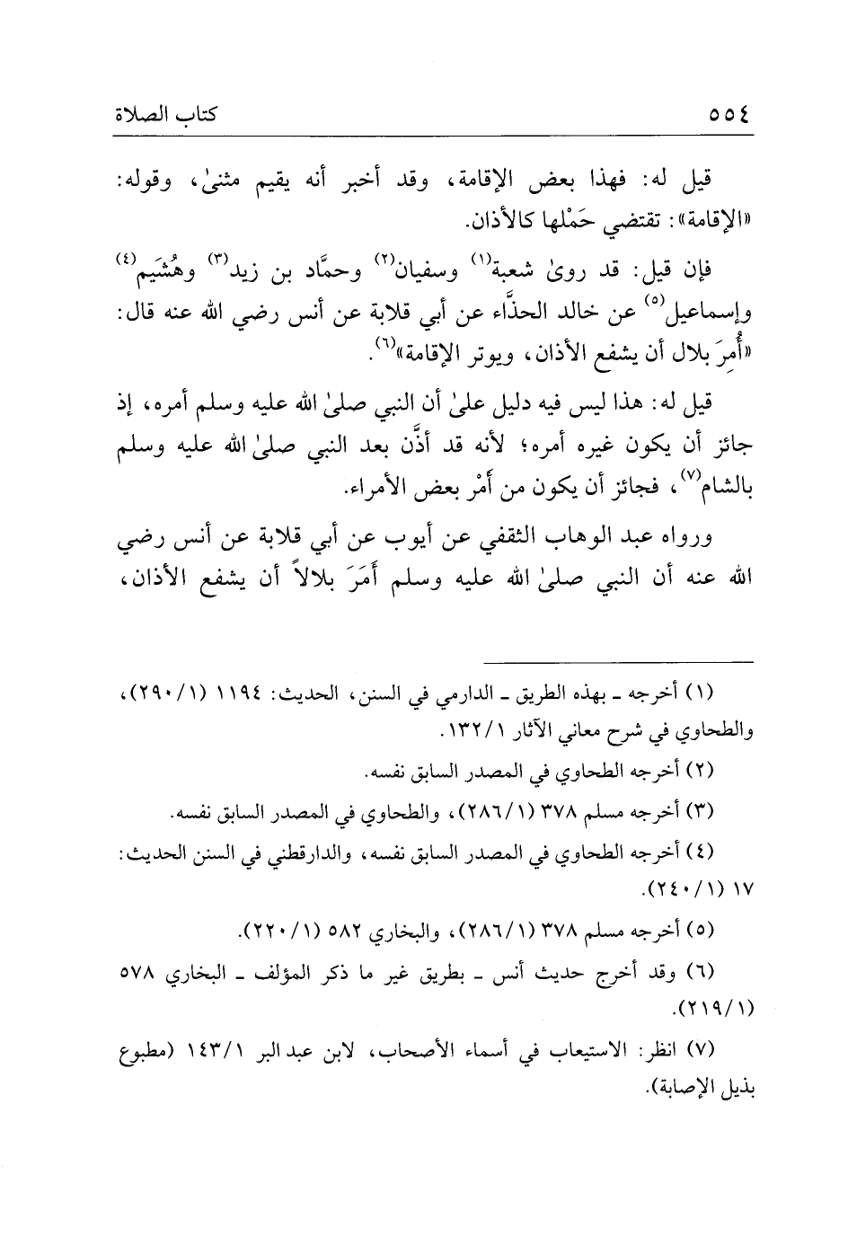 ورواه عبد الوهاب الثقفي عن أيوب عن أبي قلابة عن أنس رضي الله عنه أن النبي صلى الله عليه وسلم أمر بلالًا أن يشفع الأذان،