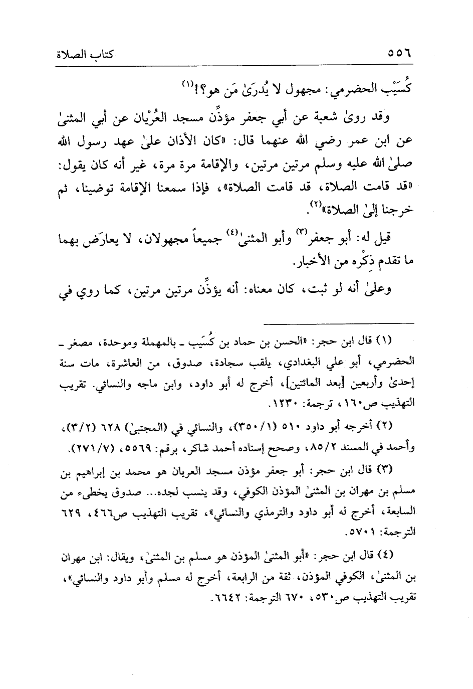 وقد روى شعبه عن أبي جعفر مؤذن مسجد العريان عن أبي المثنى عن ابن عمر رضي الله عنهما قال: "كان الأذان على عهد رسول الله صلى الله عليه وسلم مرتين مرتين، والإقامة مرة مرة، غير أنه كان يقول: "قد قامت الصلاة، قد قامت الصلاة"، فإذا سمعنا الإقامة توضينا، ثم خرجنا إلى الصلاة".
