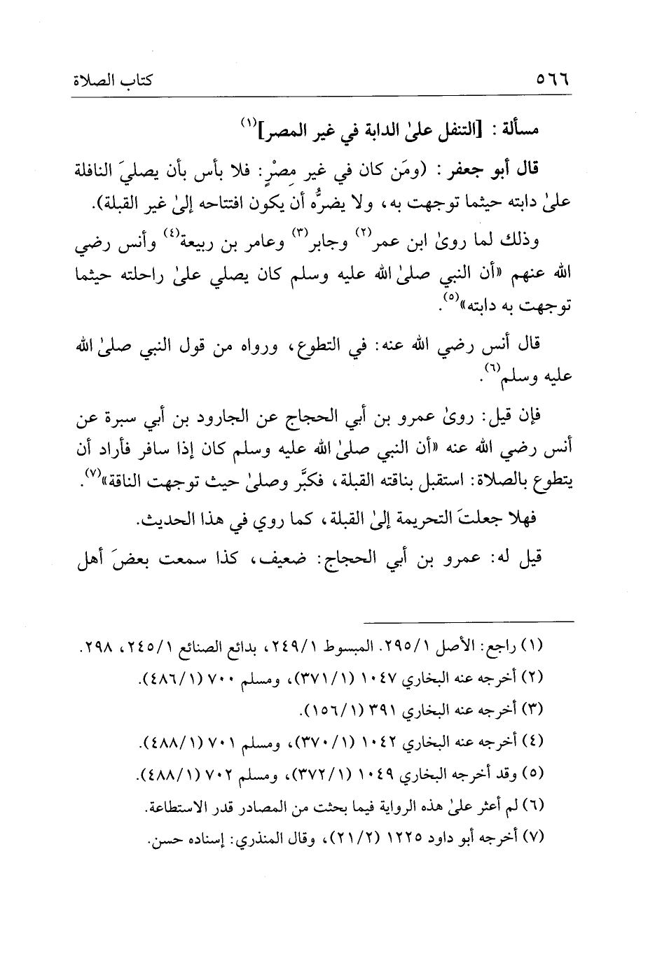 قال أبو جعفر: (ومن كان في غير مصر: فلا بأس بأن يصلي النافلة على دابته حيثما توجهت به، ولا يضره أن يكون افتتاحه إلى غير القبلة).
