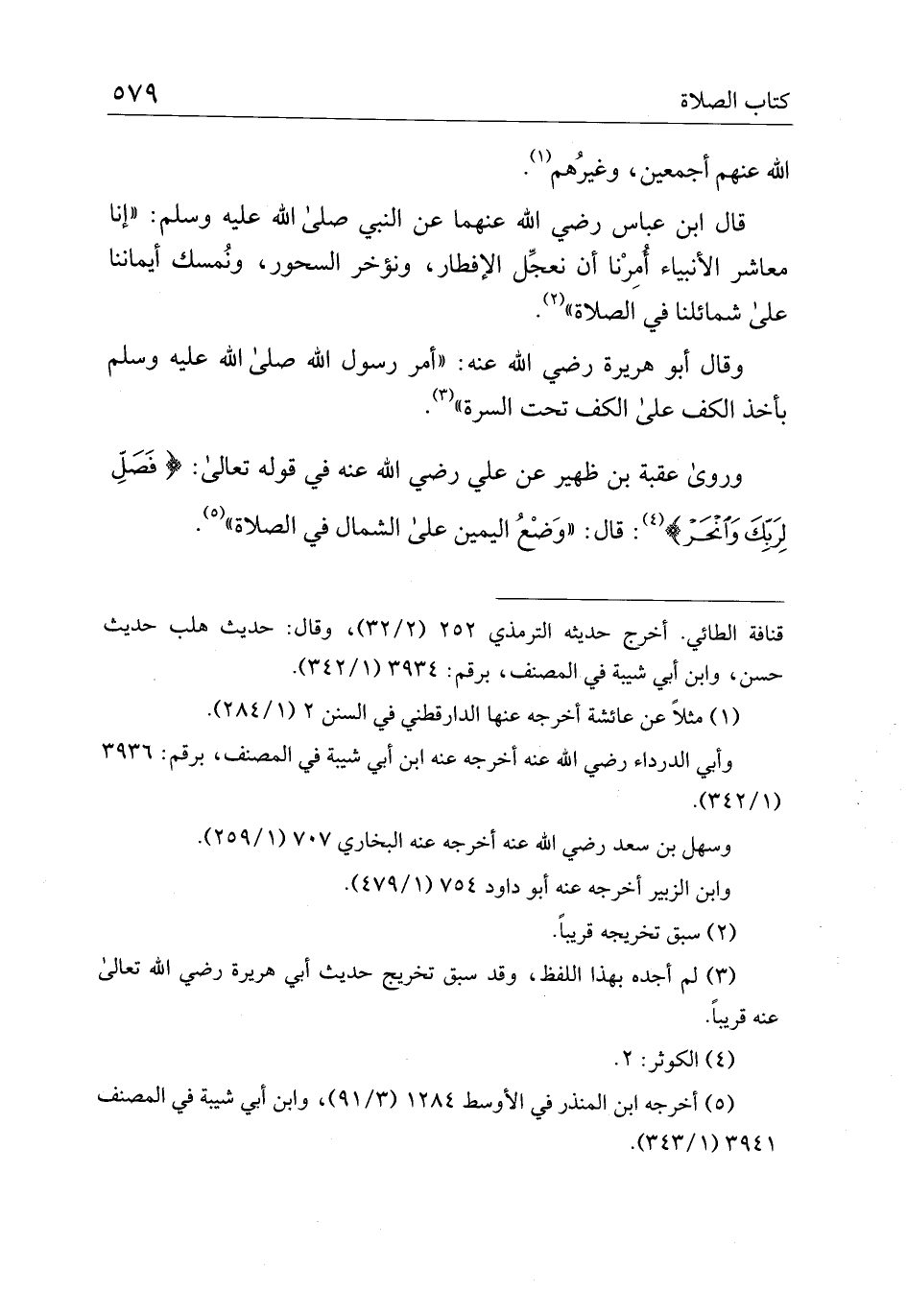 وروى عقبة عن ظهير عن علي رضي الله عنه في قوله تعالى:} فصل لربك وانحر {: قال: "وضع اليمين على الشمال في الصلاة".