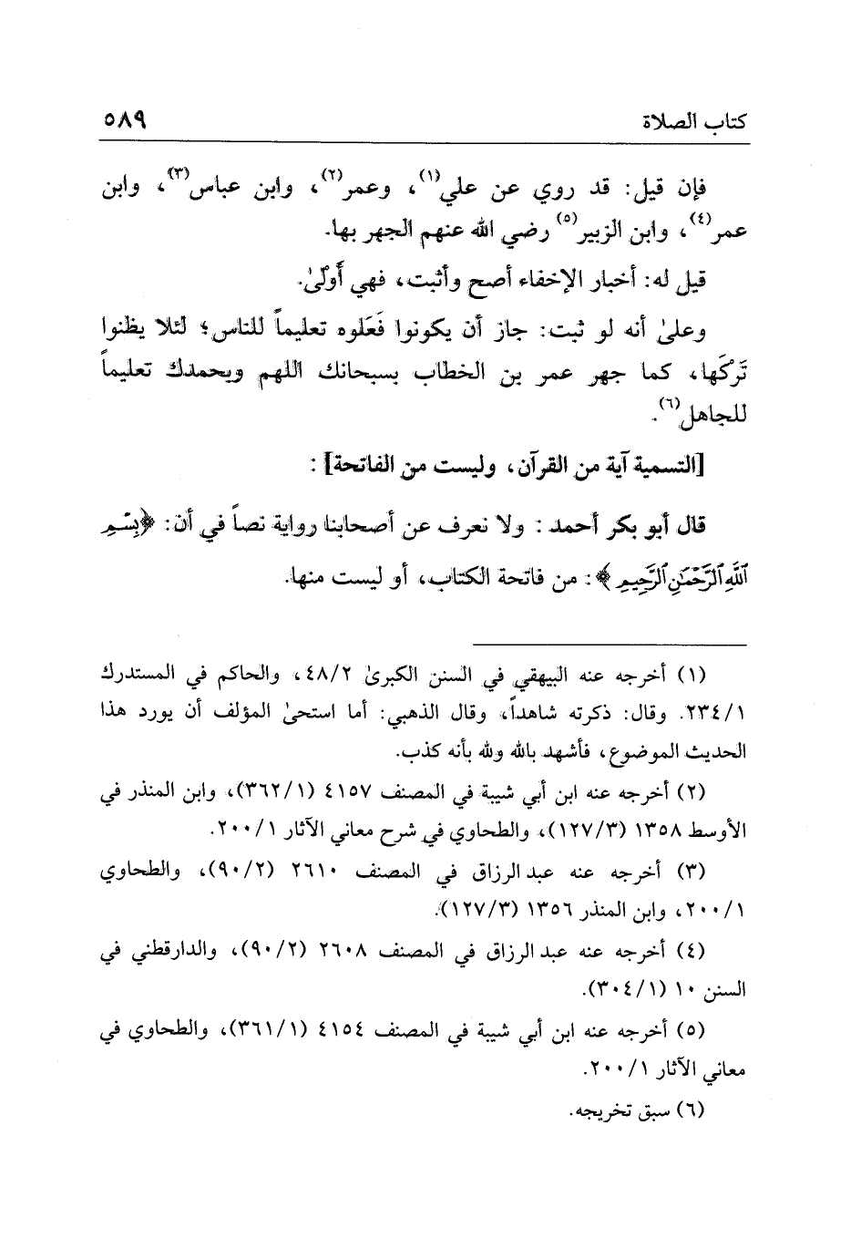 قال أبو بكر أحمد: ولا نعرف عن أصحابنا رواية نصًا في أن:} بسم الله الرحمن الرحيم {: من فاتحة الكتاب، أو ليست منها.
