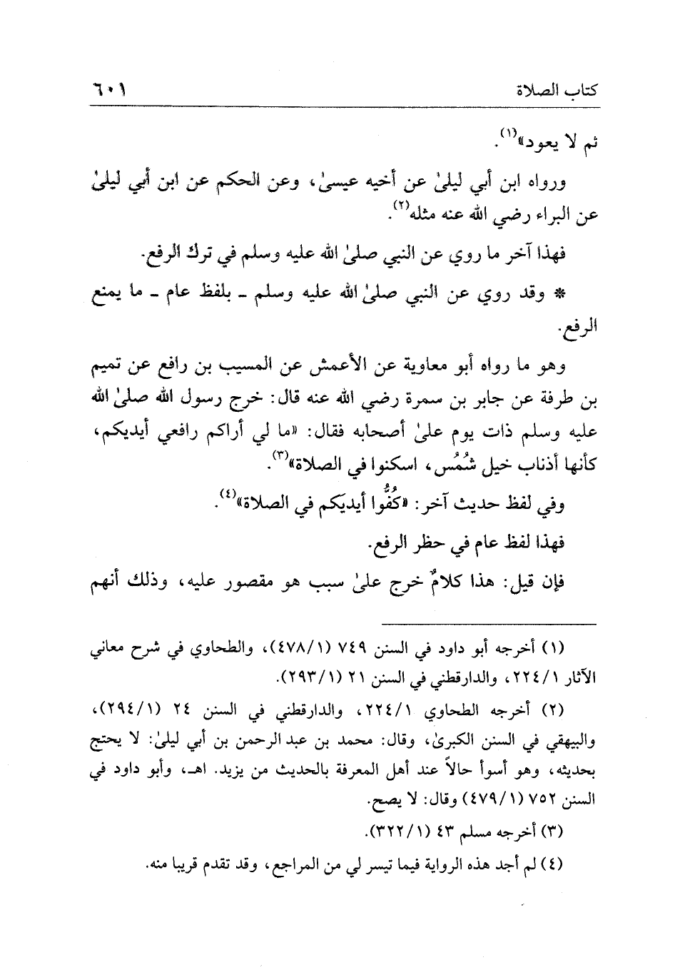 وهو ما رواه أبو معاوية عن الأعمش عن المسيب بن رافع عن تميم بن طرفة عن جابر بن سمرة رضي الله عنه قال: خرج رسول الله صلى الله عليه وسلم ذات يوم على أصحابه فقال: "ما لي أراكم رافعي أيديكم، كأنها أذناب خيل شمس، اسكنوا في الصلاة".