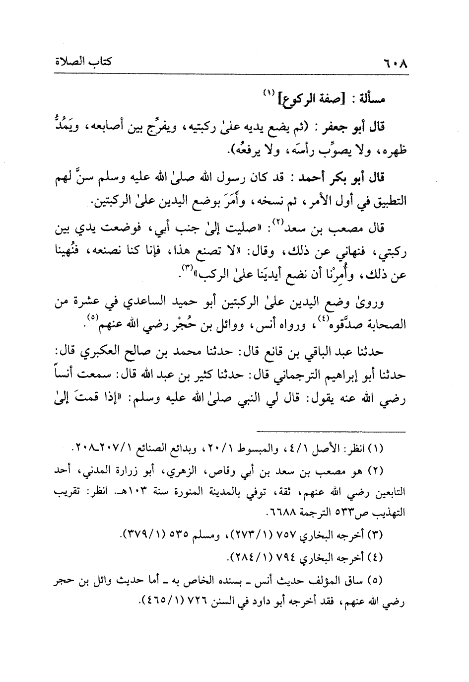 وروى وضع اليدين على الركبتين أبو حميد الساعدي في عشرة من الصحابة صدقوه، ورواه أنس، ووائل بن حجر رضي الله عنهم.