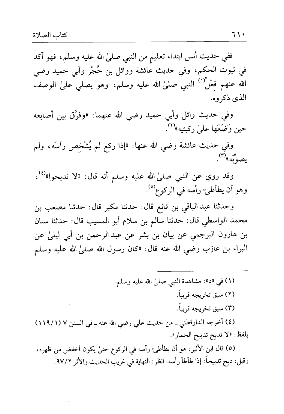 ففي حديث أنس ابتداء تعليم من النبي صلى الله عليه وسلم، فهو أكد في ثبوت الحكم، وفي حديث عائشة ووائل بن حجر وأبي حميد رضي الله عنهم فعل النبي صلى الله عليه وسلم، وهو يصلي على الوصف الذي ذكروه.