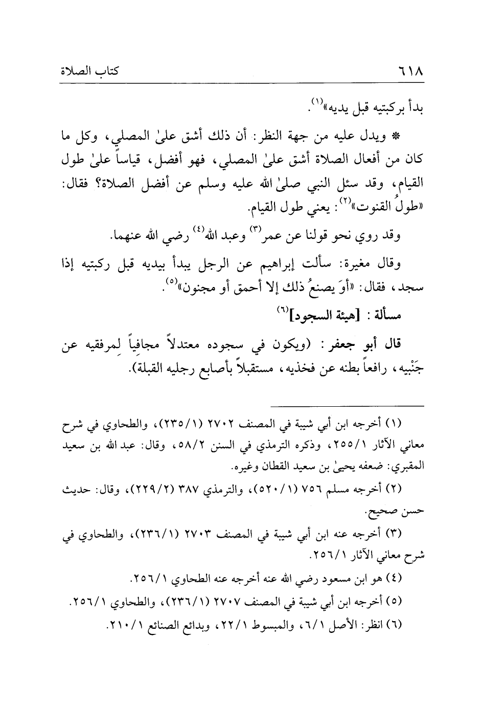 وقال مغيرة: سألت إبراهيم عن الرجل يبدأ بيديه قبل ركبتيه إذا سجد، فقال: "أو يصنع ذلك إلا أحمق أو مجنون".