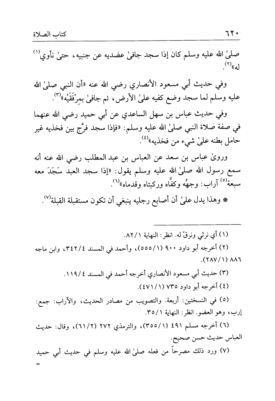 وفي حديث أبي مسعود الأنصاري رضي الله عنه "أن النبي صلى الله عليه وسلم لما سجد وضع كفيه على الأرض، ثم جافى بمرفقيه".