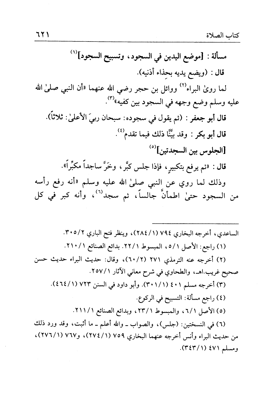لما روى البراء ووائل بن حجر رضي الله عنهما "أن النبي صلى الله عليه وسلم وضع وجهه في السجود بين كفيه".