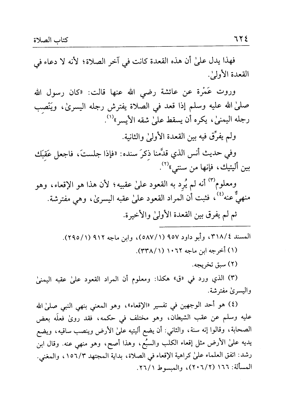 ومعلوم أنه لم يرد به القعود على عقبيه؛ لأن هذا هو الإقعاء، وهو منهي عنه، فثبت أن المراد القعود على عقبه اليسرى، وهي مفترشة.