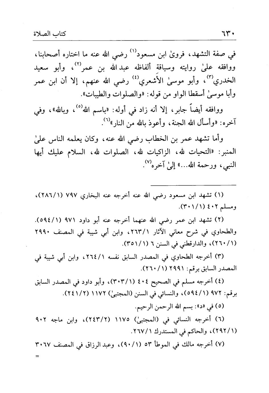في صفة التشهد، فروى ابن مسعود رضي الله عنه ما اختاره أصحابنا، ووافقه على روايته وسياقه ألفاظه عبد الله بن عمر، وأبو سعيد الخدري، وأبو موسى الأشعري رضي الله عنهم، إلا ان ابن عمر وأبا موسى أسقطا الواو من قوله: "والصلوات والطيبات".