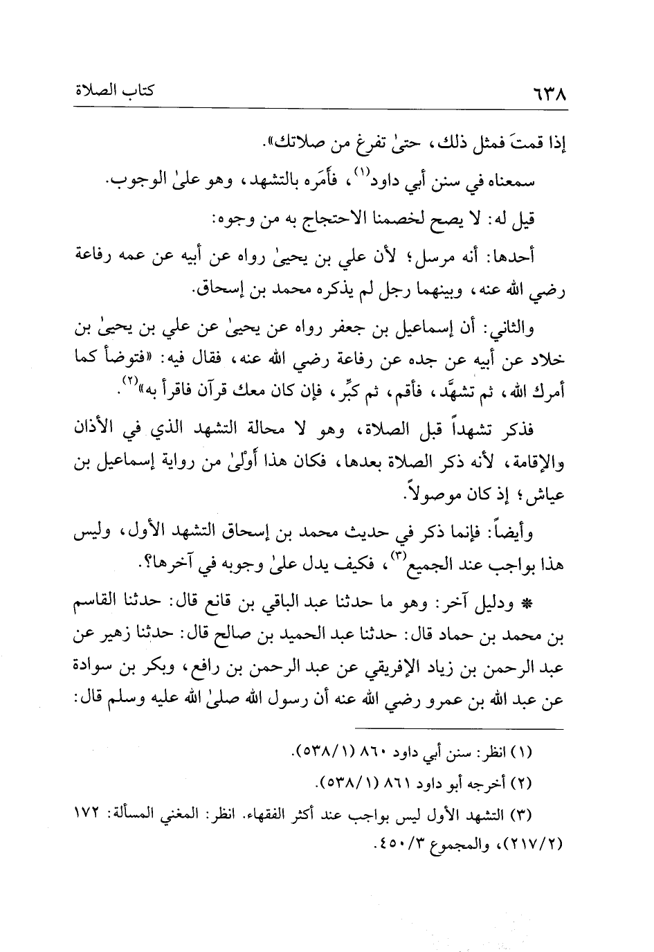 وأيضا: فإنما ذكر في حديث محمد بن إسحاق التشهد الأول، وليس هذا بواجب عند الجميع، فكيف يدل على وجوبه في آخرها؟