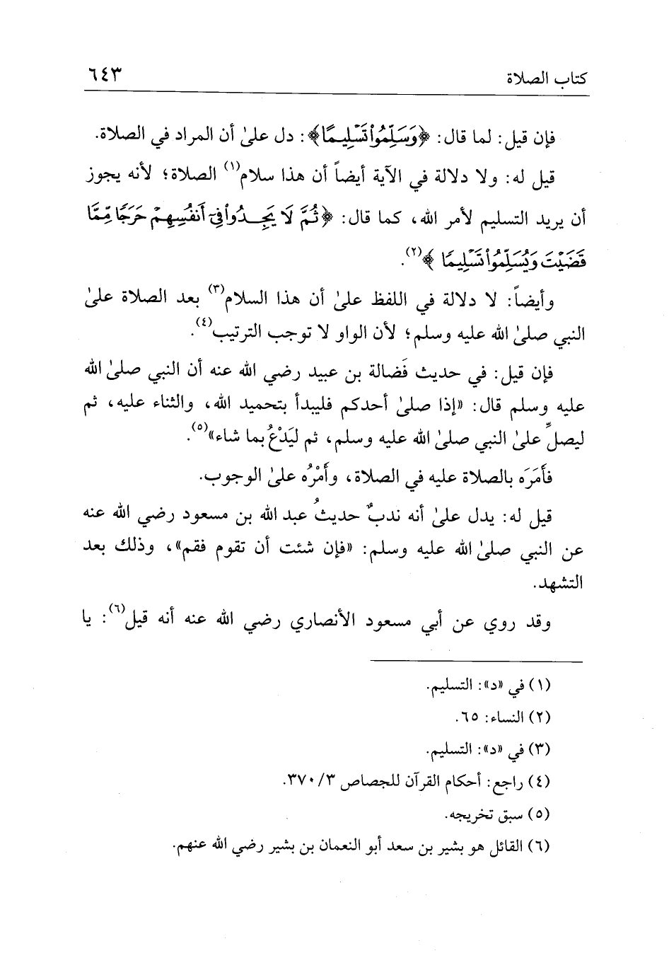 قيل له: ولا دلالة في الآية أيضا أن هذا سلام الصلاة؛ لأنه يجوز أن يريد التسليم لأمر الله، كما قال:} ثم لا يجدوا في أنفسهم حرجا مما قضيت ويسلموا تسليما {.