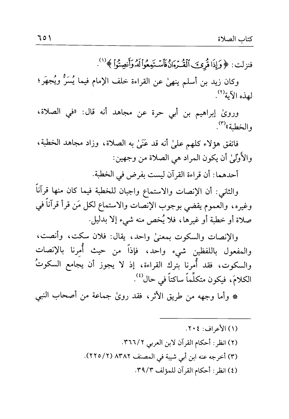 والإنصات والسكوت بمعنى واحد، يقال: فلان يسكت، وأنصت، والمفعول باللفظين شيء واحد، فإذا من حيث أمرنا بالإنصات والسكوت، فقد أمرنا بترك القراءة، إذ لا يجوز السكوت الكلام، فيكون متكلما ساكتا في حال.
