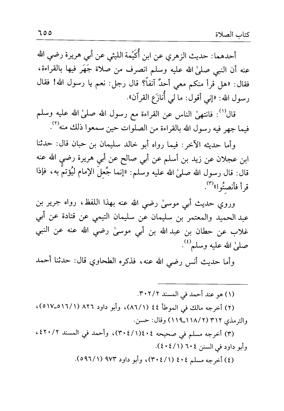 وأما حديثه الآخر: فيما رواه أبو خالد سليمان بن حبان قال: حدثنا ابن عجلان عن زيد بن أسلم عن أبي صالح عن أبي هريرة رضي الله عنه قال: قال رسول الله صلى الله عليه وسلم: "إنما جعل الإمام ليؤتم به، فإذا قرأ فأنصتوا".