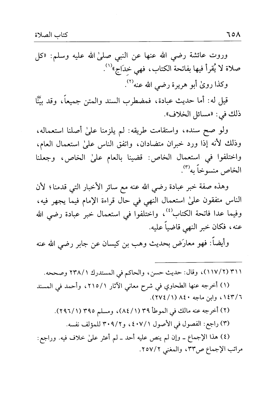وهذه صفة خبر عبادة رضي الله عنه مع سائر الأخبار التي قدمنا؛ لأن الناس متفقون على استعمال النهي في حال قراءة الإمام فيما يجهر فيه، وفيما عدا فاتحة الكتاب، واختلفوا في استعمال خبر عبادة رضي الله عنه، فكان خبر النهي قاضيا عليه.