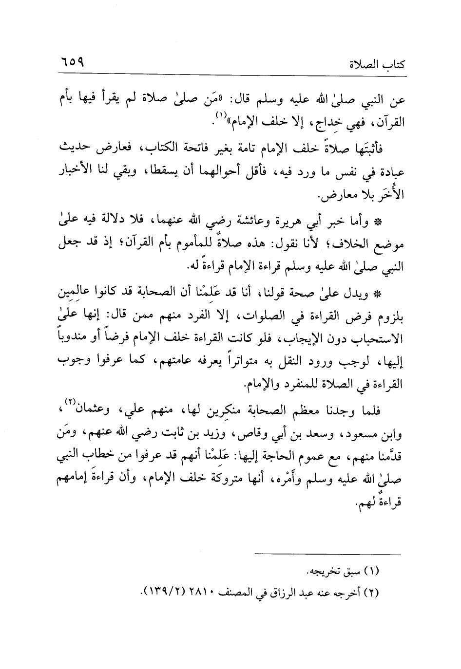 فلما وجدنا معظم الصحابة منكرين لها، منهم علي، وعثمان، وابن مسعود، وسعد بن أبي وقاص، زيد بن ثابت رضي الله عنهم، ومن قدمنا منهم، مع عموم الحاجة إليها: علمنا أنهم قد عرفوا من خطاب النبي صلى الله عليه وسلم وأمره، أنها متروكة خلف الإمام، وأن قراءة إمامهم قراءة لهم.
