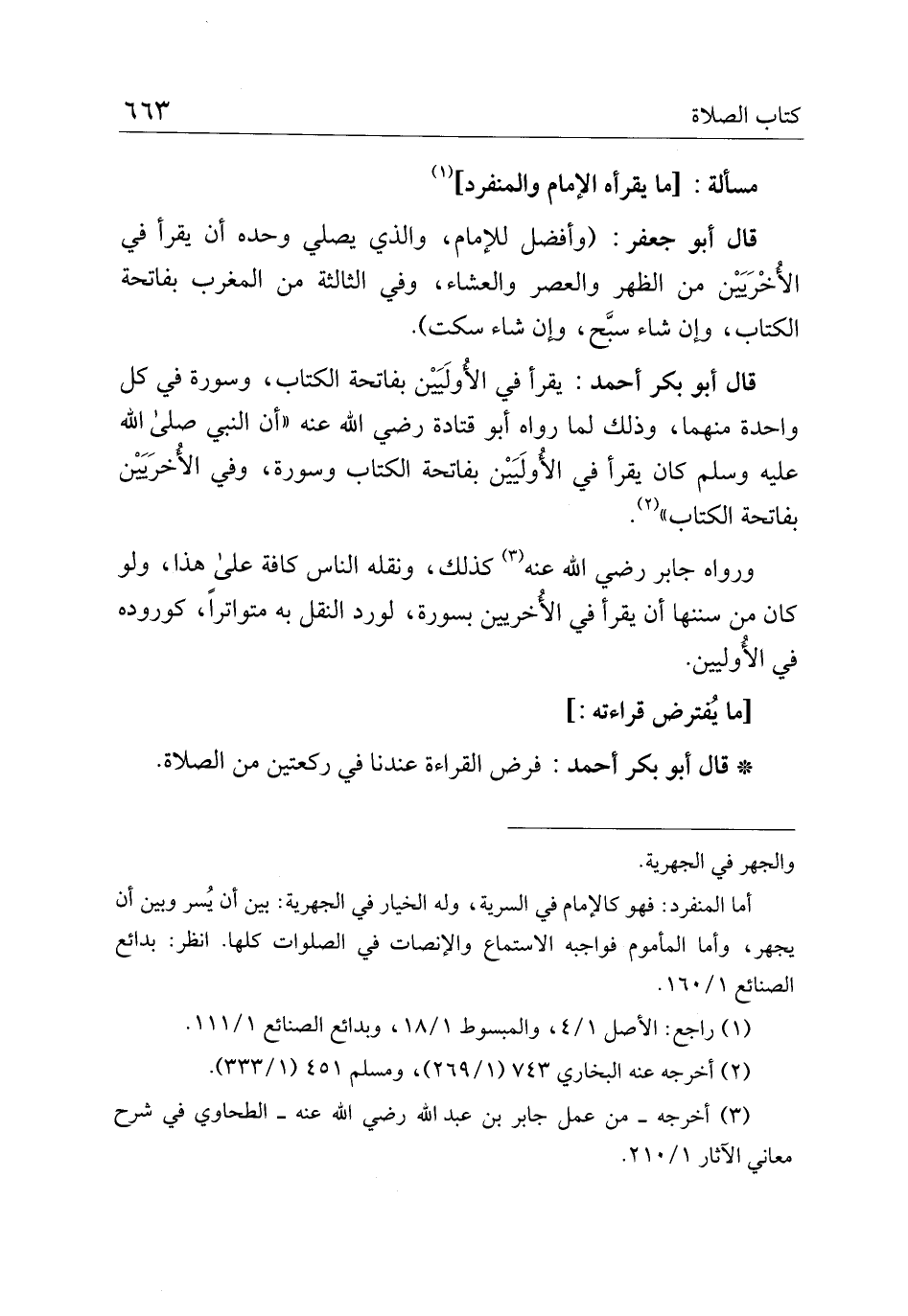 قال أبو بكر أحمد: يقرأ في الأوليين بفاتحة الكتاب، وسورة في كل واحدة منهما، وذلك لما رواه أبو قتادة رضي الله عنه "أن النبي صلى الله عليه وسلم كان يقرأ في الأوليين بفاتحة الكتاب وسورة، وفي الأخريين بفاتحة الكتاب".