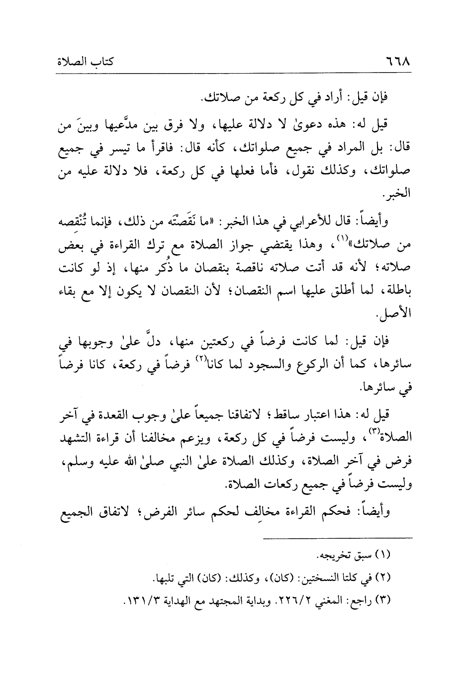 قيل له: هذا اعتبار ساقط؛ لاتفاقنا جميعا على وجوب القعدة في آخر الصلاة، وليست فرضا في كل ركعة، ويزعم مخالفنا أن قراءة التشهد فرض في آخر الصلاة، وكذلك الصلاة على النبي صلى الله عليه وسلم، وليست فرضا في جميع ركعات الصلاة.