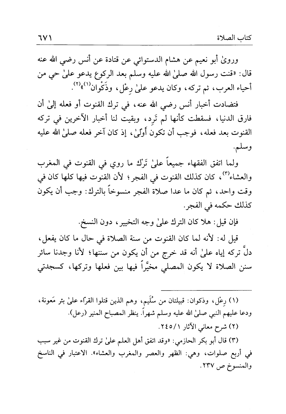 وروى أبو نعيم عن هشام الدستوائي عن قتادة عن أنس رضي الله عنه قال: "قنت رسول الله صلى الله عليه وسلم بعد الركوع يدعو على حي من أحياء العرب، ثم تركه، وكان يدعو على رعل، وذكوان".