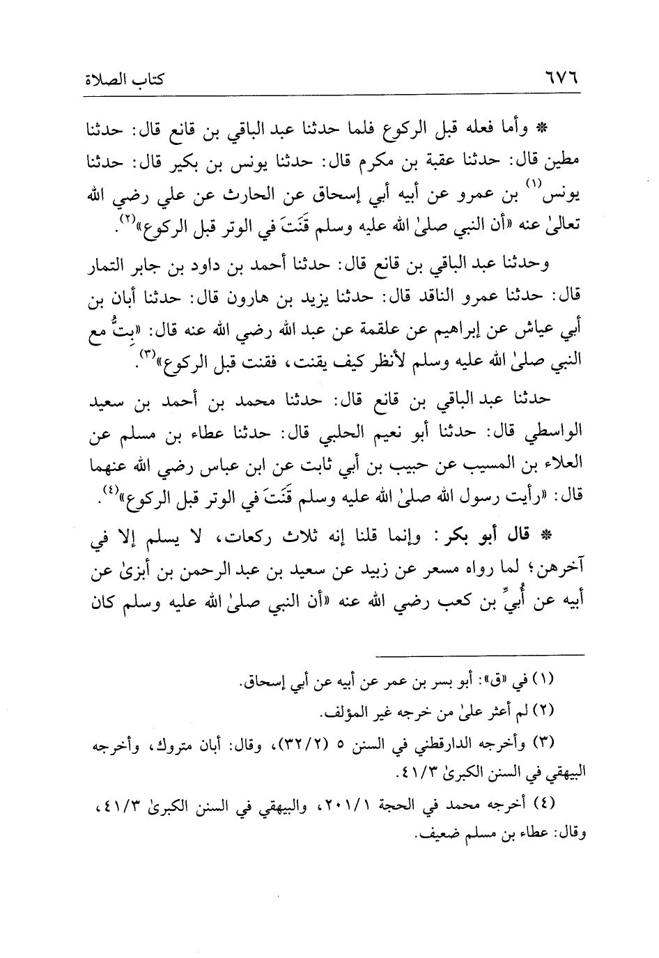 * وأما فعله قبل الركوع فلما حدثنا عبد الباقي بن قانع قال: حدثنا مطين قال: حدثنا عقبة بن مكرم قال: حدثنا يونس بن بكير قال: حدثنا يونس بن عمرو عن أبيه أبي إسحاق عن الحارث عن علي رضي الله تعالى عنه "أن النبي صلى الله عليه وسلم قنت في الوتر قبل الركوع".
