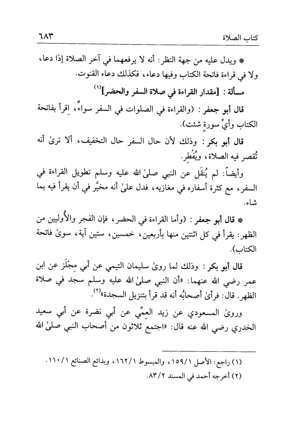 قال أبو جعفر: (والقراءة في الصلوات في السفر سواء، اقرأ بفاتحة الكتاب وأي سورة شئت).