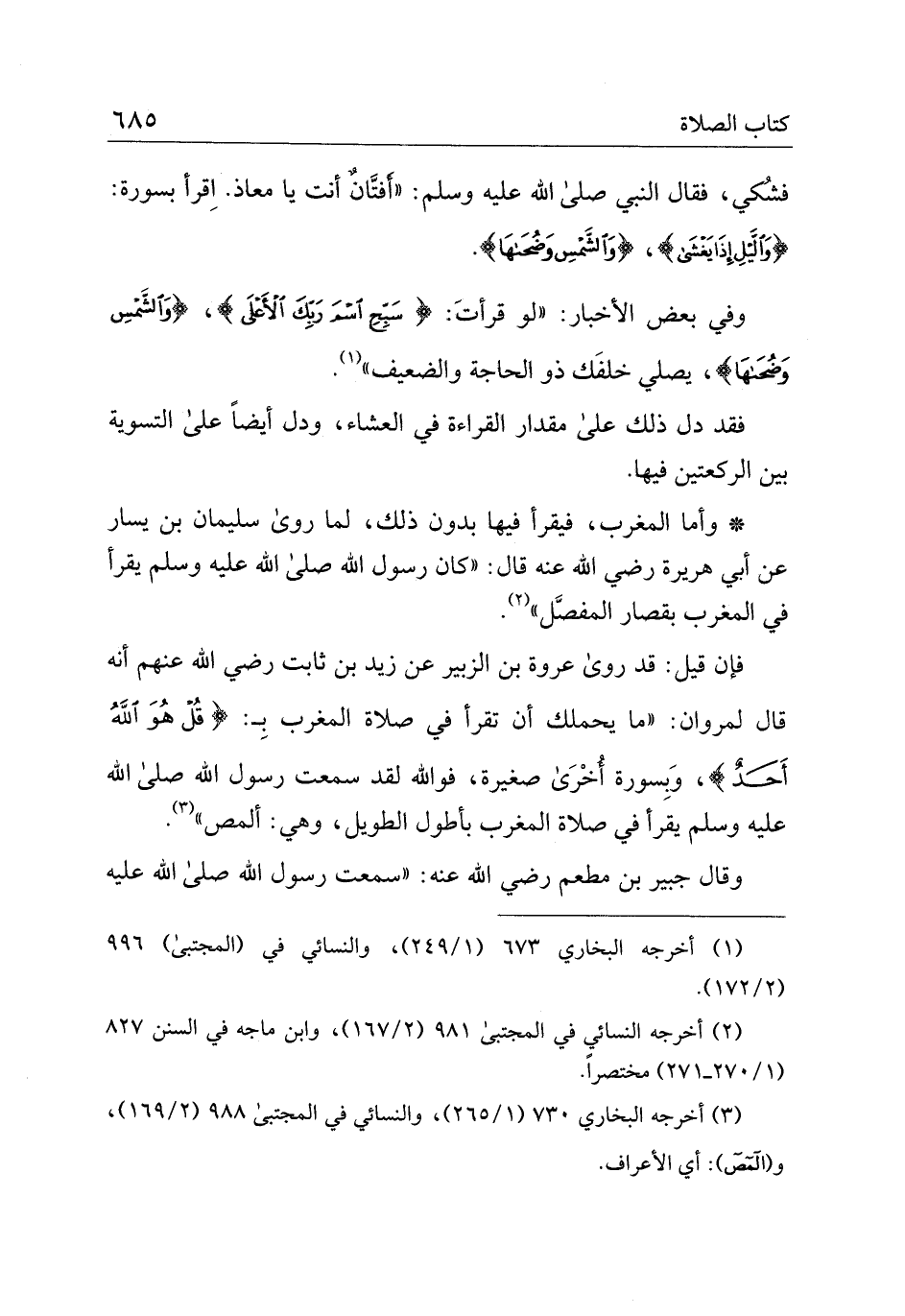 فشكي، فقال النبي صلى الله عليه وسلم: "أفتان أنت يا معاذ اقرأ بسورة:} والليل إذا يغشي {،} والشمس وضحاها {.