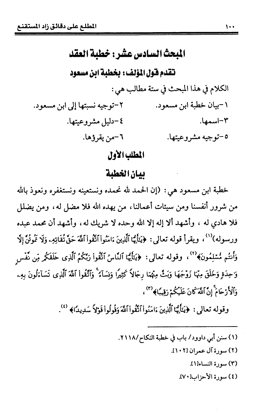 خطبة ابن مسعود هي: (إن الحمد لله نحمده ونستعينه ونستغفره ونعوذ بالله من شرور أنفسنا ومن سيئات أعمالنا، من يهده الله فلا مضل له، ومن يضلل فلا هادي له، وأشهد ألا إله إلا الله وحده لا شريك له، وأشهد أن محمد عبده ورسوله) (¬1)، ويقرأ قوله تعالى: {يَا أَيُّهَا الَّذِينَ آمَنُوا اتَّقُوا اللَّهَ حَقَّ تُقَاتِهِ وَلَا تَمُوتُنَّ إِلَّا وَأَنْتُمْ مُسْلِمُونَ} (¬2)، وقوله تعالى: {يَاأَيُّهَا النَّاسُ اتَّقُوا رَبَّكُمُ الَّذِي خَلَقَكُمْ مِنْ نَفْسٍ وَاحِدَةٍ وَخَلَقَ مِنْهَا زَوْجَهَا وَبَثَّ مِنْهُمَا رِجَالًا كَثِيرًا وَنِسَاءً وَاتَّقُوا اللَّهَ الَّذِي تَسَاءَلُونَ بِهِ وَالْأَرْحَامَ إِنَّ اللَّهَ كَانَ عَلَيْكُمْ رَقِيبًا} (¬3)،