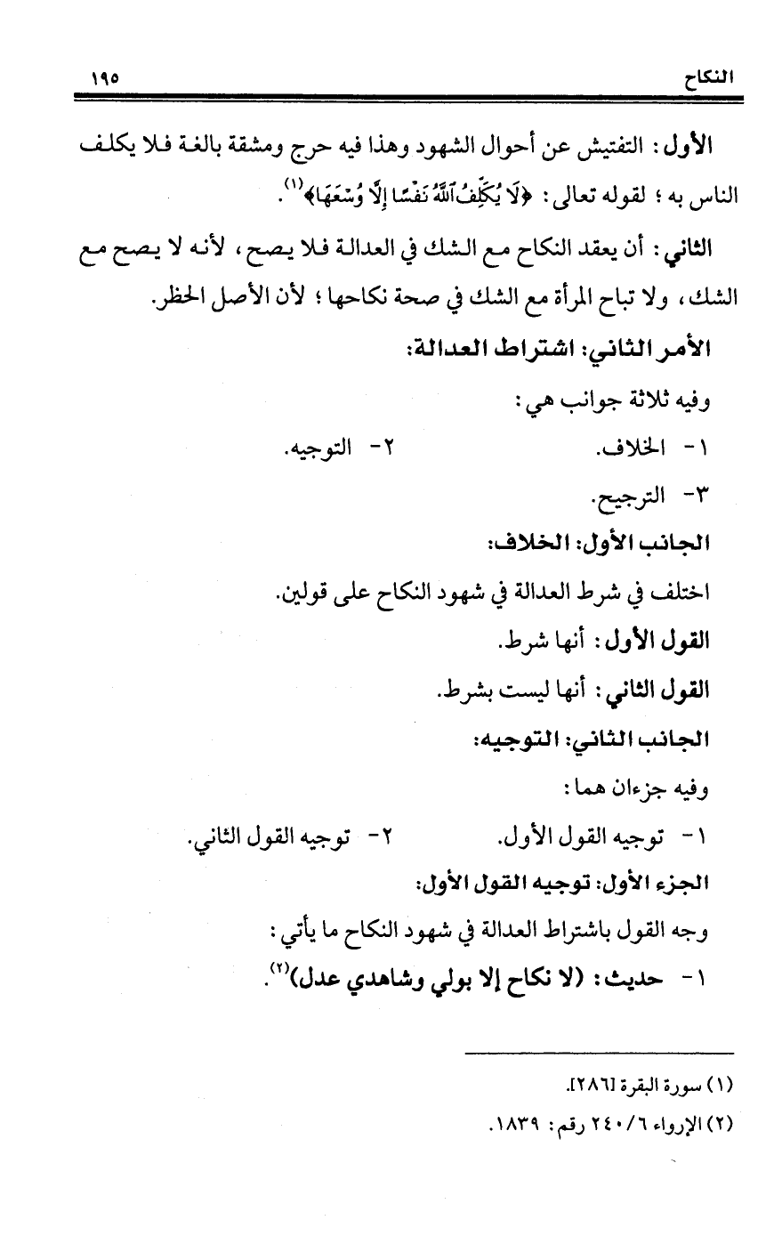 الثاني: أن يعقد النكاح مع الشك في العدالة فلا يصح؛ لأنه لا يصح مع الشك، ولا تباح المرأة مع الشك في صحة نكاحها؛ لأن الأصل الحظر.