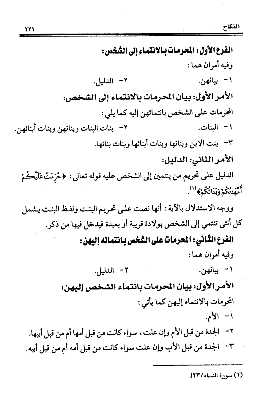 الدليل على تحريم من ينتمين إلى الشخص عليه قوله تعالى: {حُرِّمَتْ عَلَيْكُمْ أُمَّهَاتُكُمْ وَبَنَاتُكُمْ} (¬1).