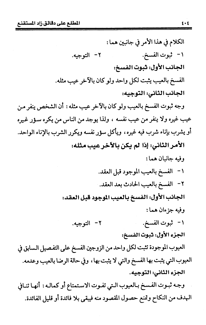 العيوب الموجودة تثبت لكل واحد من الزوجين الفسخ على التفصيل السابق في العيوب التي يثبت بها الفسخ والتي لا يثبت بها، وفي حالة الرضا بالعيب وعدمه.