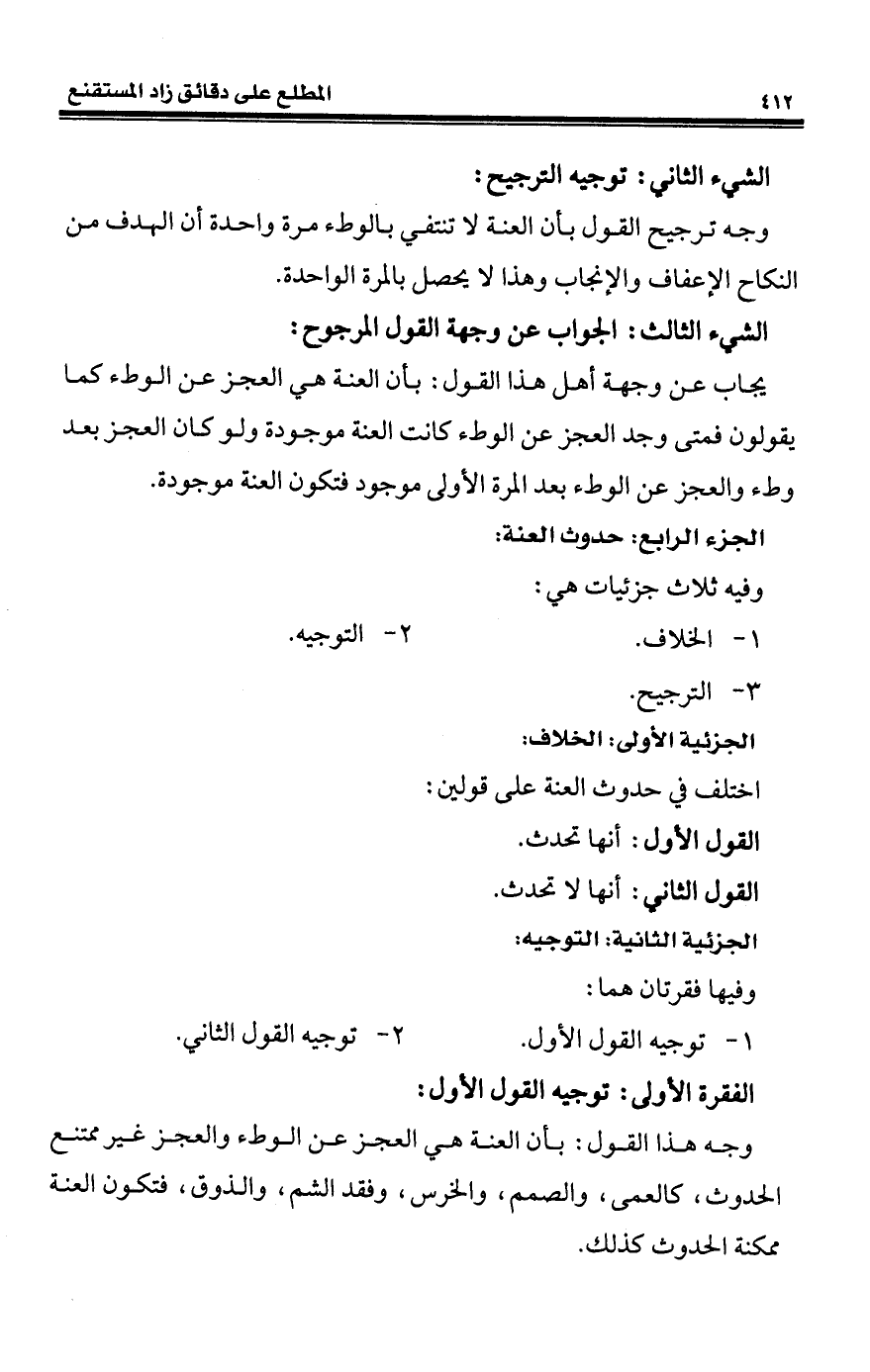يجاب عن وجهة أهل هذا القول: بأن العنة هي العجز عن الوطء كما يقولون فمتى وجد العجز عن الوطء كانت العنة موجودة ولو كان العجز بعد وطء والعجز عن الوطء بعد المرة الأولى موجود فتكون العنة موجودة.