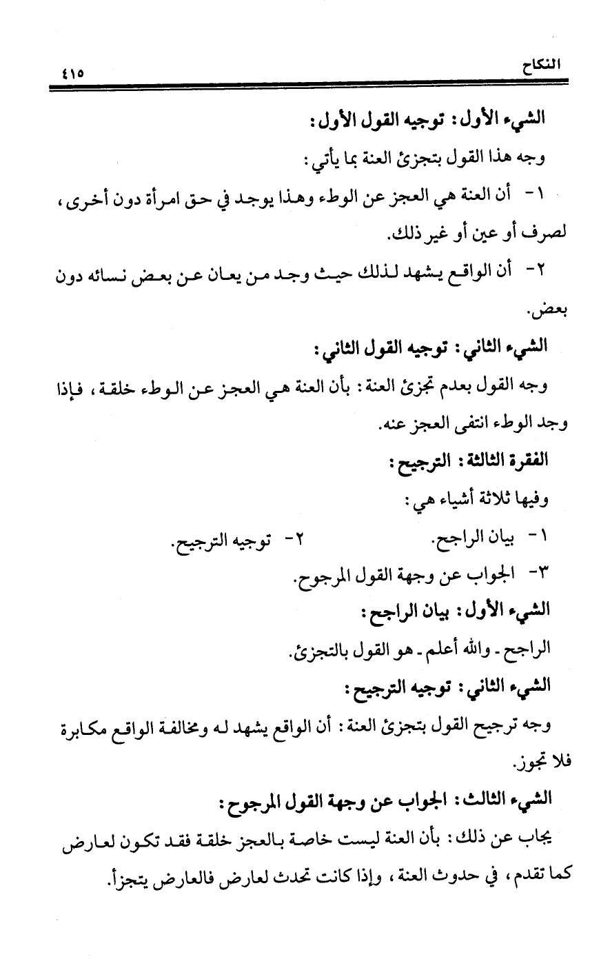 1 - أن العنة هي العجز عن الوطء وهذا يوجد في حق امرأة دون أخرى، لصرف أو عين أو غير ذلك.