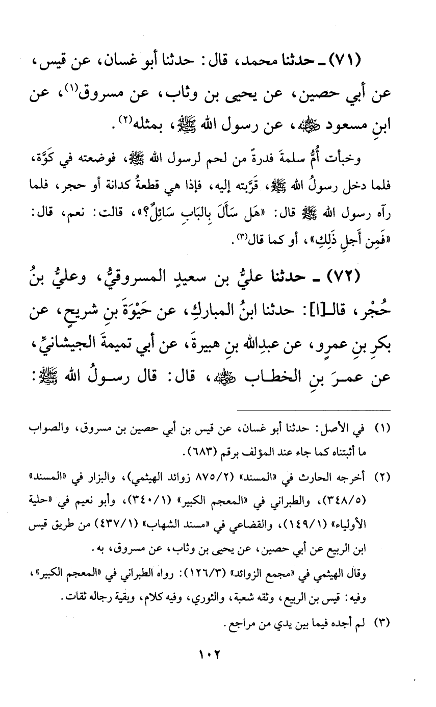 71 - حدثنا محمد، قال: حدثنا أبو غسان، عن قيس، عن أبي حصين، عن يحيى بن وثاب، عن مسروق، عن ابن مسعود رضي الله عنه، عن رسول الله صلى الله عليه وسلم، بمثله.