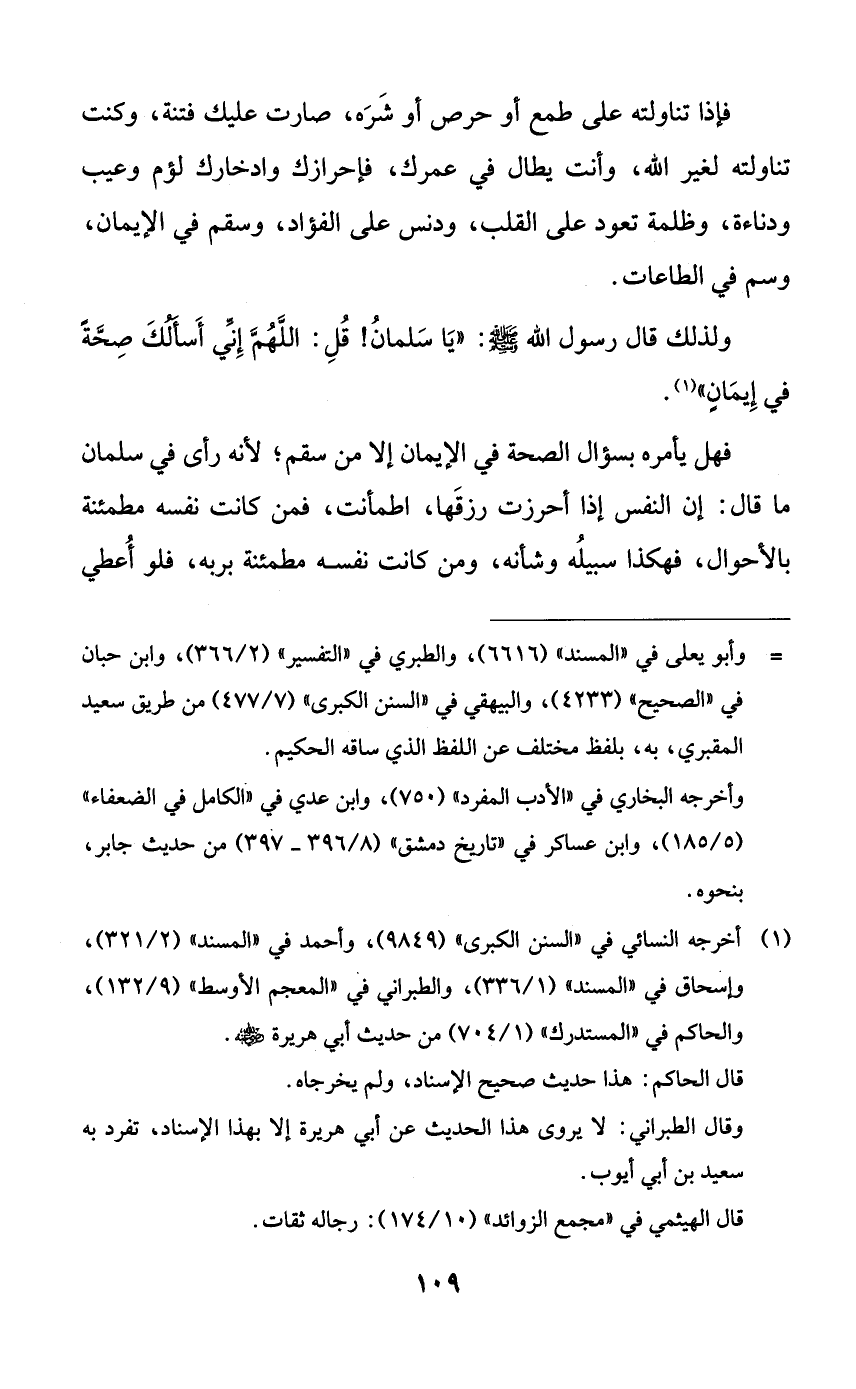 فهل يأمره بسؤال الصحة في الإيمان إلا من سقم؛ لأنه رأى في سلمان ما قال: إن النفس إذا أحرزت رزقها، اطمأنت، فمن كانت نفسه مطمئنة بالأحوال، فهكذا سبيله وشأنه، ومن كانت نفسه مطمئنة بربه، فلو أعطي