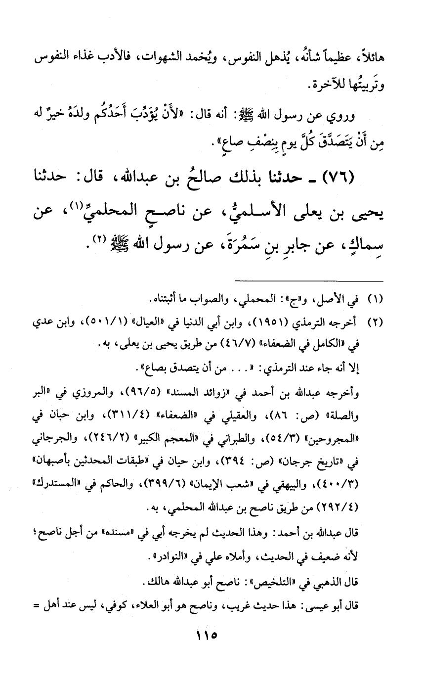 76 - حدثنا بذلك صالح بن عبد الله، قال: حدثنا يحيى بن يعلى الأسلمي، عن ناصحٍ المحلمي، عن سماكٍ، عن جابر بن سمرة، عن رسول الله صلى الله عليه وسلم.