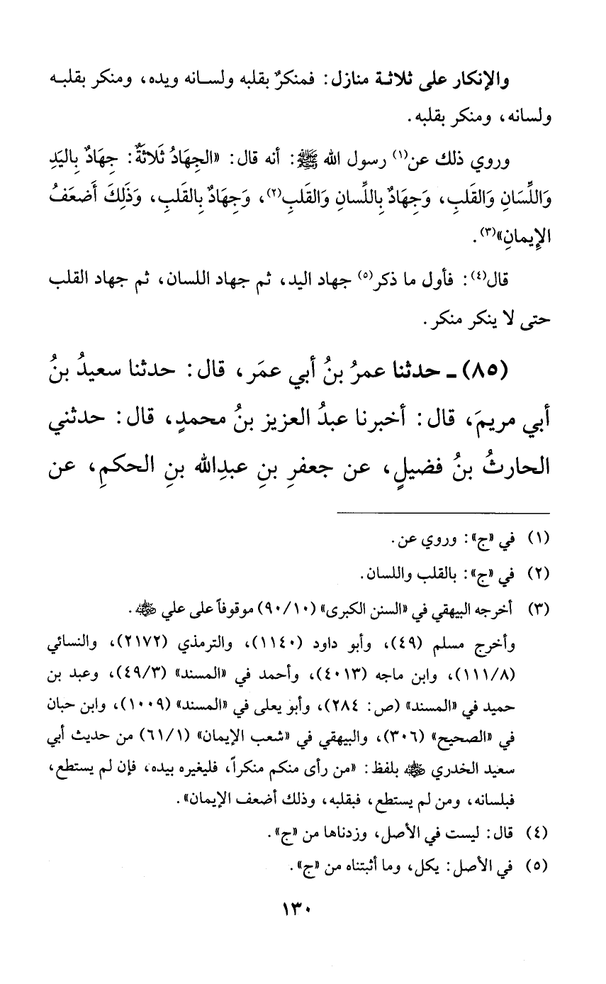 قال: فأول ما ذكر جهاد اليد، ثم جهاد اللسان، ثم جهاد القلب حتى لا ينكر منكر.