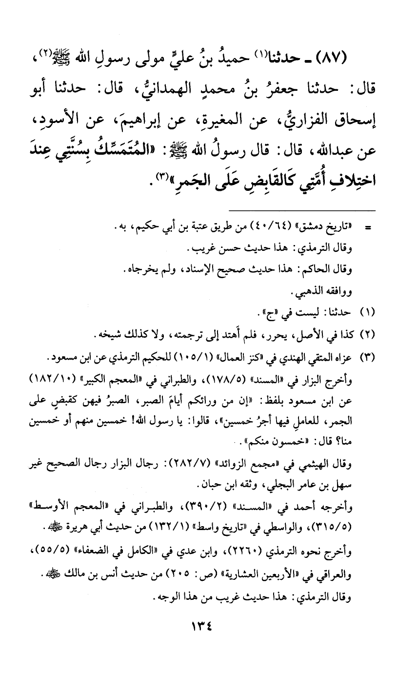 87 - حدثنا حميد بن عليٍّ مولى رسول الله صلى الله عليه وسلم، قال: حدثنا جعفر بن محمدٍ الهمداني، قال: حدثنا أبو إسحاق الفزاري، عن المغيرة، عن إبراهيم، عن الأسود، عن عبد الله، قال: قال رسول الله صلى الله عليه وسلم: ((المتمسك بسنتي عند اختلاف أمتي كالقابض على الجمر)).