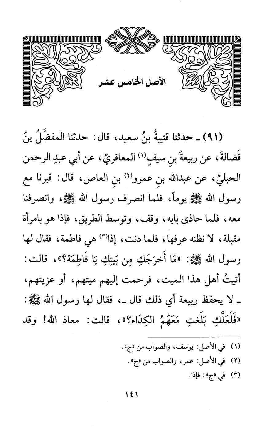 91 - حدثنا قتيبة بن سعيد، قال: حدثنا المفضل بن فضالة، عن ربيعة بن سيفٍ المعافري، عن أبي عبد الرحمن الحبلي، عن عبد الله بن عمرو بن العاص، قال: قبرنا مع رسول الله صلى الله عليه وسلم يوماً، فلما انصرف رسول الله صلى الله عليه وسلم، وانصرفنا معه، فلما حاذى بابه، وقف، وتوسط الطريق، فإذا هو بامرأة مقبلة، لا نظنه عرفها، فلما دنت، إذا هي فاطمة، فقال لها رسول الله صلى الله عليه وسلم: ((ما أخرجك من بيتك يا فاطمة؟))، قالت: أتيت أهل هذا الميت، فرحمت إليهم ميتهم، أو عزيتهم -لا يحفظ ربيعة أي ذلك قال-، فقال لها رسول الله صلى الله عليه وسلم: ((فلعلك بلغت معهم الكداء؟))، قالت: معاذ الله! وقد