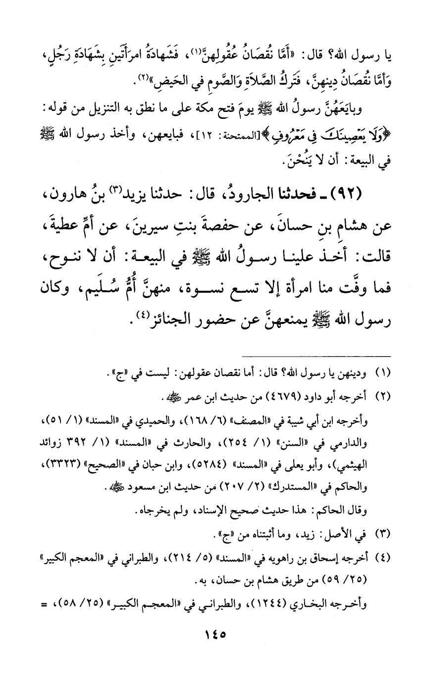 92 - فحدثنا الجارود، قال: حدثنا يزيد بن هارون، عن هشام بن حسان، عن حفصة بنت سيرين، عن أم عطية، قالت: أخذ علينا رسول الله صلى الله عليه وسلم في البيعة: أن لا ننوح، فما وفت منا امرأة إلا تسع نسوة، منهن أم سليم، وكان رسول الله صلى الله عليه وسلم يمنعهن عن حضور الجنائز.