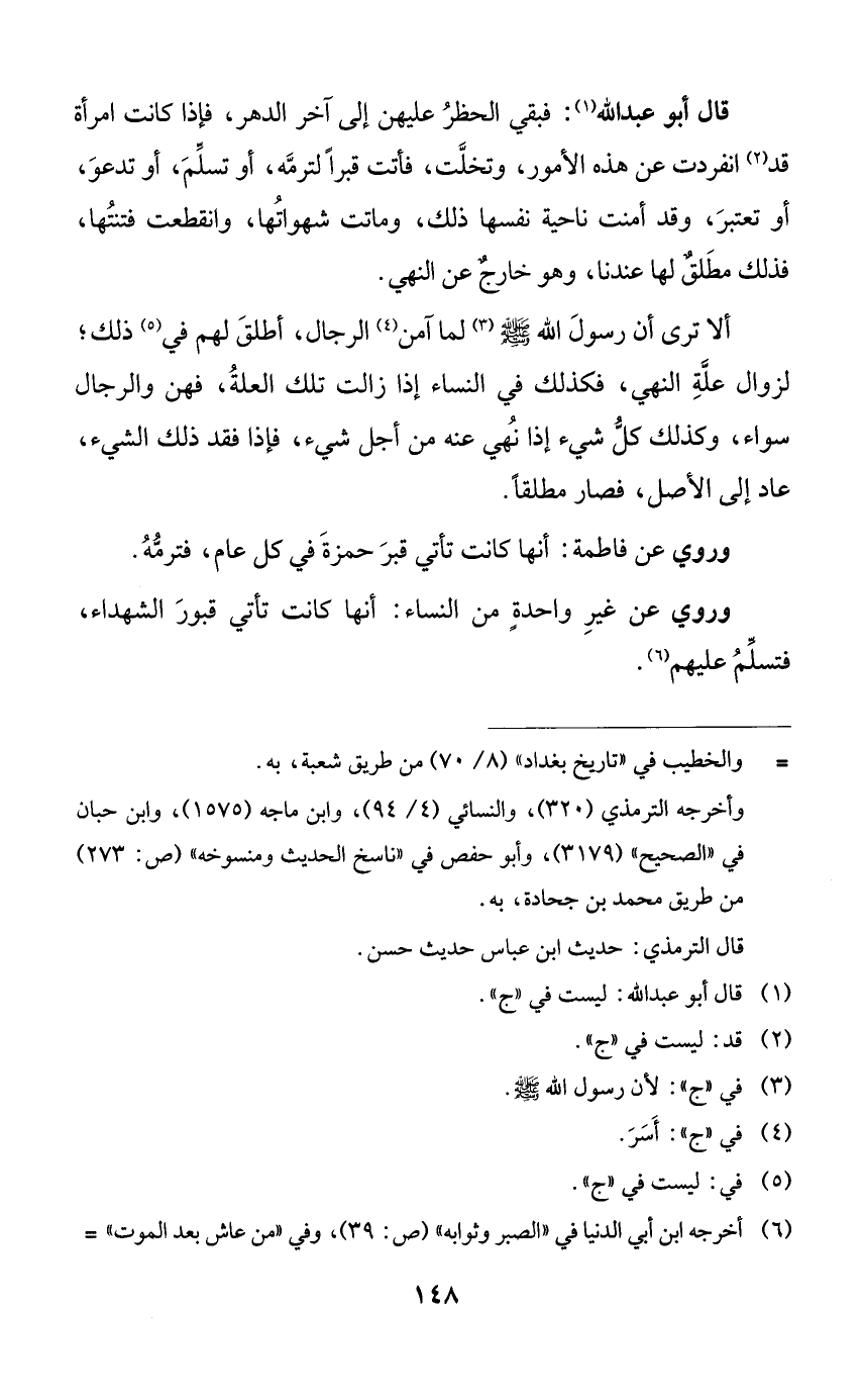 قال أبو عبد الله: فبقي الحظر عليهن إلى آخر الدهر، فإذا كانت امرأة قد انفردت عن هذه الأمور، وتخلت، فأتت قبراً لترمه، أو تسلم، أو تدعو، أو تعتبر، وقد أمنت ناحية نفسها ذلك، وماتت شهواتها، وانقطعت فتنتها، فذلك مطلقٌ لها عندنا، وهو خارجٌ عن النهي.
