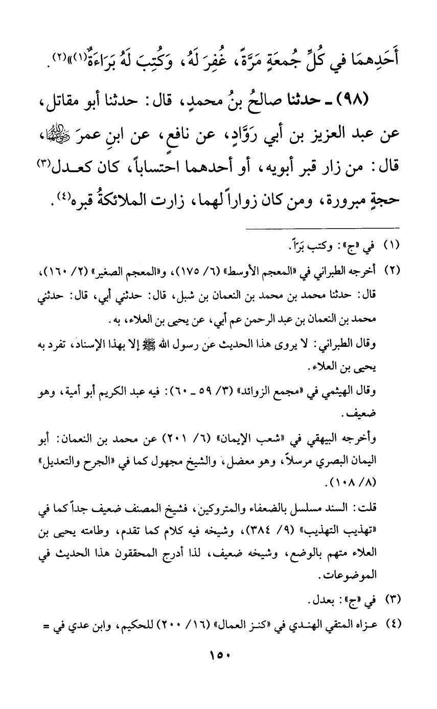 98 - حدثنا صالح بن محمدٍ، قال: حدثنا أبو مقاتل، عن عبد العزيز بن أبي روادٍ، عن نافعٍ، عن ابن عمر رضي الله عنهما قال: من زار قبر أبويه، أو أحدهما احتساباً، كان كعدل حجةٍ مبرورة، ومن كان زواراً لهما، زارت الملائكة قبره.